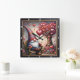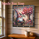 This charming square wall clock features a whimsical digital illustration of a classic garden gnome sitting on a rustic wooden bench. The gnome is dressed in a tall, patterned knit hat and a cozy blue sweater, holding a single heart-shaped balloon. Next to him stands a magnificent, stylized tree with a trunk that blossoms into dozens of pink and red hearts of various sizes and patterns. The scene is set against a soft, wooden plank background and is further decorated with blooming flowers and hanging heart ornaments. The artwork is set within a modern black wood-grain frame with bold white numeric markers for easy readability. This functional home accessory is a perfect decorative piece for garden lovers or as a heartwarming Valentine Day gift. Its detailed folklore aesthetic and romantic theme provide a cozy focal point for any room.
