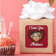 Valentine heart shih tzu love Custom photo name sticker. Shihtzu with text I love you on dark red. Personalise with your name and photo. Valentines dog lovers gifting idea. Beautiful adorable cuddly dog lying on the floor. Brown and white puppy with long hair, big round dreamy eyes and black nose.