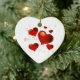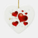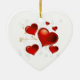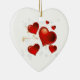 This Valentine ornament is shown in a heart shape with a red hearts print.