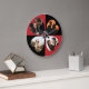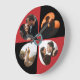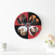 Personalised Valentine's Day large round clock with 4 heart shaped photos on red and black background .