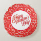This round shape throw pillow is shown in a lovely red and white Valentine hearts print.