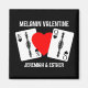 Stylish Valentine MELANIN QUEEN KING PLAYING CARDS couples magnet, with CUSTOMIZABLE TEXT. Design shows a black king chess piece and a black queen chess piece in the form of playing cards with red heart and heart flutters in between. There is CUSTOMIZABLE TEXT at the top and bottom which you can personalise with your name(s) or delete. Declare your love during Valentine season and throughout the year. Can also be given for Black History Month to celebrate your awesome melanin relationship.