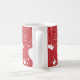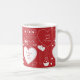 A mug designed with a two names valentine pattern, white on red. Customise the mug with your heart names, background colour, among other options.
