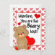 Have a Beary sweet Valentines with this adorable teddy bear greeting card. Features a teddy bear hiding a heart with a fun red doodle heart background. Message inside can be personalized.