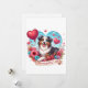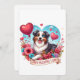 Valentine's day card featuring an Australian Shepherd with flowers and a heart shaped balloons. The dog has one brown eye and one blue eye.