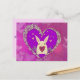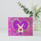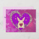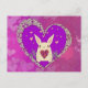 Sweet Valentine's Day bunny with hearts sends good wishes and love. The cute little rabbit holds a heart that says "love" and sits within a heart shape that's framed with crocheted lace. The card colours are shades of pink and purple. The back reads: Somebunny wishes you a happy Valentine's Day.