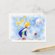 The picture on this card brings to mind my favorite part of The Little Prince. I especially like the strings on the stars which make it seem as if the prince is presenting a bouquet of stars to his rose, which is so important to him. There are no words on this card, but the colors in the picture have been well-chosen.
