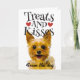 Valentine's Day card treats and kisses...from your Yorkshire Terrier. Customised Valentine's Day card for the dog lover. Customisation options: background colour. Don't forget to change the greeting inside the card.
