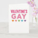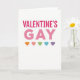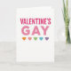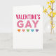 This card features a simple white background with a strong message front and center. The top line reads “VALENTINE’S” in bright fuchsia, and right below it the word “GAY” appears in a softer medium pink. Both words are in uppercase sans-serif block letters, giving the text a modern, straightforward look, and they sit neatly in the middle of the card. Under the words, there’s a row of five small hearts with rounded shapes, lined up evenly. The hearts are colored orange, coral, lime green, aquamarine, and lavender, echoing a pride-inspired palette in a gentle, pastel way. With lots of open space around the text and hearts, the design feels focused and easy to take in, while still saying something warm and inclusive. It’s a sweet choice for romance, friendship, or anyone you want to celebrate on Valentine’s Day ❤️💌🍫 share your feelings and let someone know they’re loved.