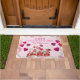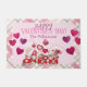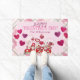 This cute, custom Valentine's day doormat features a pink and red watercolor design. An illustration of a little Valentine train with gnomes is pictured at the bottom. Severeal hearts accent the image. The border features a wholesome pink plaid pattern.