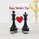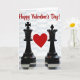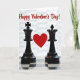 This Valentine's Day card shows two black chess pieces, a king on the left with a cross on top and a queen on the right with a crown-like top. Between them floats a bright red heart, centered like the focus of the whole scene ❤️. The pieces look calm and steady, facing forward as if they’re standing together. A black-and-white chessboard sits along the bottom, with a slight shine that reflects the bases of the pieces. At the top, the words “Happy Valentine’s Day!” appear in red script lettering, easy to spot against the lighter background 💌. The background has a soft pattern and gentle lighting that makes the heart and the glossy pieces stand out. Overall, it feels like a sweet message about love and partnership, even in a game of strategy