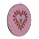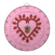 This awesome dart board features a digital art image of an acorn surrounded by a red heart. The acorn is brown with a green cap and cute little eyes with black pupils and a smile on its face. the heart surrounding the acorn has a series of pretty red oak leaves attached to it pointing outside the heart creating a beautiful leafy pattern.