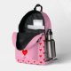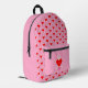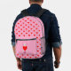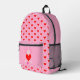 This awesome backpack features a digital art image of a cute axolotl, a Mexican Salamander, holding a red heart. The Axolotl is pale pink with huge black eyes and a big pink smile. It has bright pink feathery gills on the side of its head and a bright pink plume on its tail. There is custom pink text inside the heart so you can include the initial of the recipient.