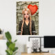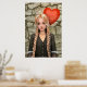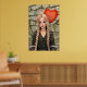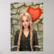 3D digital render of a beautiful teenager girl in a retro dress holding a balloon in a heart form on a stone wall background. Perfect Valentine's Day gift