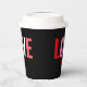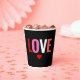 Enjoy your hot beverage with these Valentines Day Red Heart Love Coffee Paper Cups. The cups are modern simple designed with the word "LOVE" in large bold block lettering in colours of red, pink, white and coral around customisable black background. A small red heart is below the text. Available with lid or without.