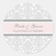 Bride and Groom custom name sticker envelope seals for Valentine's Day themed wedding, with elegant and modern light pastel blush pink, grey and white vintage floral damask pattern. Fully customisable with your own text, the perfect addition to your Valentine's Day wedding invitations.