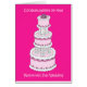 A simple image of a multi tiered wedding cake iced in delicate white and pastel pink, set against a deep pink coloured background. The words 'Congratulations on your Valentine's Day Wedding' accompany the image.