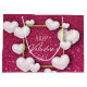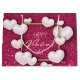 Happy Valentine's Day festive sparkle glitter burgundy dark red background illustration with white realistic 3D hearts and gold foil frame. Text written in modern script letters.