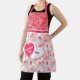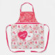 Beautiful apron has a red and white leaf and floral pattern on it. The top is separated from the bottom by a red and white faux ribbon. The bottom is a pattern of pink, red and white roses and hearts. A few larger hearts are in the center and say "World's Greatest Chef - Mom" You can personalize it by changing the name to Grammy or someone's name with the easy to use template provided.