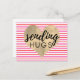 Sending hugs postcard with a gold watercolor heart agasint a red and pink striped background. A great way to let someone know you're thinking of them.