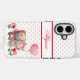 This iphone cover features an adorable teddy bear couple who are in love. He's carrying flowers and she's carrying a balloon that says Love. The background is white with light red hearts and you put in your name with the "personalize this template" button. Super cute gift for Valentine's Day!