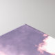 A solitary hot-air balloon floats through the pale pink canyon between towering clouds. The sun, low in the pastel sky, glows behind the edge of the billows, sending streams of bright light towards the viewer.