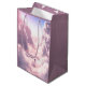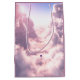 A solitary hot-air balloon floats through the pale pink canyon between towering clouds. The sun, low in the pastel sky, glows behind the edge of the billows, sending streams of bright light towards the viewer.