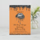 Editable Halloween vampire adult party invitation. Design features black lips with vampire fangs and dripping with blood on an orange background! Glamourous black glitter dripping, black glitter and sparkles frame the card. Personalise the text and change the font style and colour to suit. The glitter is not "actual real" glitter but a printed effect.