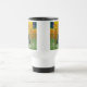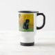 Travel Mug featuring a black cat in the style of Van Gogh! This black kitty sits by a chair upon a green floor against a background of Starry Night decoration. A fabulous gift for cat lovers and Dutch art collectors!