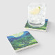 Stone Coaster featuring Vincent van Gogh’s oil painting Olive Trees in a Mountainous Landscape (1889). Green olive trees decorate a mountainside underneath a starry night sky. A marvellous gift for lovers of Post-Impressionism and Dutch art collectors!
