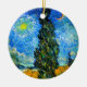 Ornament featuring Vincent van Gogh’s oil painting Road with Cypress and Star (1890), also known as Country Road in Provence by Night. People walk along a road passing a beautiful cypress tree underneath a blue night sky with yellow moon and stars. A fantastic gift for fans of Post-Impressionism and Dutch art.
