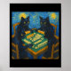 Van gogh starry night cat playing mahjong chinese poster