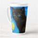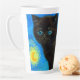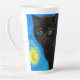 Latte Mug featuring a Van Gogh cat in the style of Starry Night! A fluffy black kitten perches on a table against a blue night sky and yellow moon. A purr-fect gift for cat lovers and Dutch art collectors!
