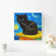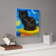 Clock featuring a Van Gogh cat in the style of Starry Night! A fluffy black kitten perches on a table against a blue night sky and yellow moon. A purr-fect gift for cat lovers and Dutch art collectors!