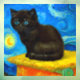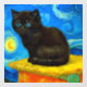 Window Cling featuring a Van Gogh cat in the style of Starry Night! A fluffy black kitten perches on a table against a blue night sky and yellow moon. A purr-fect gift for cat lovers and Dutch art collectors!