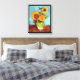 Oil on canvas from 1888 showing bright yellow sunflowers in a green vase against a turquise blue background.