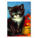 Photo Print featuring a beautiful Van Gogh tuxedo cat! This little kitty poses next to a basket of orange flowers upon a red table. A great gift for cat lovers and Dutch art collectors!