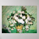 Van Gogh Vase with Pink Roses poster. Oil painting on canvas from the 1890. Van Gogh created many gorgeous paintings of flowers throughout his career. Vase with Pink Roses is perhaps one of his most enigmatic and critically celebrated. Despite the title, the pink roses depicted have faded to an uncanny white, and the background and table instead emphasise a haunting green. Just a touch of pink remains of the flowers that hang heavy over the side of the vase and fall about the table. A beautiful flower painting for lovers of Van Gogh, post-impressionism, roses, and French art.