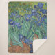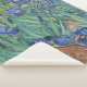 This beautiful sherpa blanket is inspired by Irises painted by Vincent van Gogh in 1889. The image boasts blue irises with green stems and leaves with pointy tips planted in the red-brown earth.