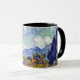 Vincent Van Gogh's Wheatfield With Cypresses. Oil on canvas from 1889 shows a golden field of wheat, a tall cypress tree, olive trees and the Les Alpilles mountains as seen from Van Gogh's window at the asylum at Saint-Remy. Keywords: Cypress, Tree, Cornfield, Landscape, Painting