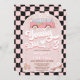 Retro style third birthday invitation for a girl featuring a van, daisies, skateboard, roller blades, wavy checkerboard and non editable retro style heading on a dusty pink arch.