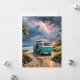 A van is parked on a beach with colourful flowers and trees surrounding it, as dramatic storm clouds part to reveal light breaking through the sky. The scene captures a contrast between the turbulent atmosphere and the peaceful seaside setting.