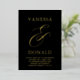 Modern wedding invitation featuring a simple and minimal layout with your names and an elegant ampersand in a large format above your event details. All text on the front is in real foil over a black background and may be changed in the design editing tool.