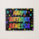 This vibrant and exciting birthday-themed jigsaw puzzle design features the message "HAPPY BIRTHDAY, VANESSA" with the characters having a colourful rainbow spectrum inspired gradient pattern, in addition to a lively field of stars background pattern. An exciting puzzle like this might be a fun way to send a birthday greeting message to somebody named Vanessa. [~Z0000468]