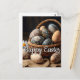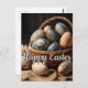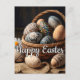 This holiday postcard features several unique Easter eggs resting in a beautiful basket.