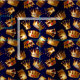Various gold crowns with gems on blue & black embellished background, seamless repeat pattern