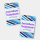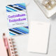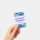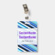 This badge design features a pattern of lines or striped coloured various shades of blue. It also features a customisable name in purple coloured text within a light coloured area. There is also a customisable message under the name that could show information such as a job title, or a profession, or a business/company name. [~Z0000176]