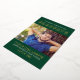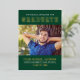 Show your school pride with this bold varsity-style graduation party invitation featuring "Graduate" in gold foil collegiate lettering on a rich green background with a prominent senior portrait. The front reads "We Proudly Announce Our Graduate" for a celebratory touch. The back displays "Graduation Party" event details with a second photo in coordinating green typography on white. All text is fully customisable, including the graduate's name, school, class year, and event details.