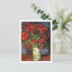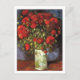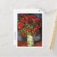 A fine art postcard with the post-impressionist painting, Vase with Red Poppies (1886) by Vincent van Gogh (1853-1890). A still life showcasing a vibrant group of red poppies in a porcelain decanter on a table.