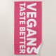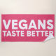 This graphic features bold, pink typography stating “VEGANS TASTE BETTER” prominently. The design employs a modern, eye-catching font that emphasises the positive message about veganism. The bright colour scheme and strong text create an engaging visual, appealing to those who appreciate or promote plant-based lifestyles. This piece can serve as a slogan for a vegan campaign, restaurant, or awareness initiative
